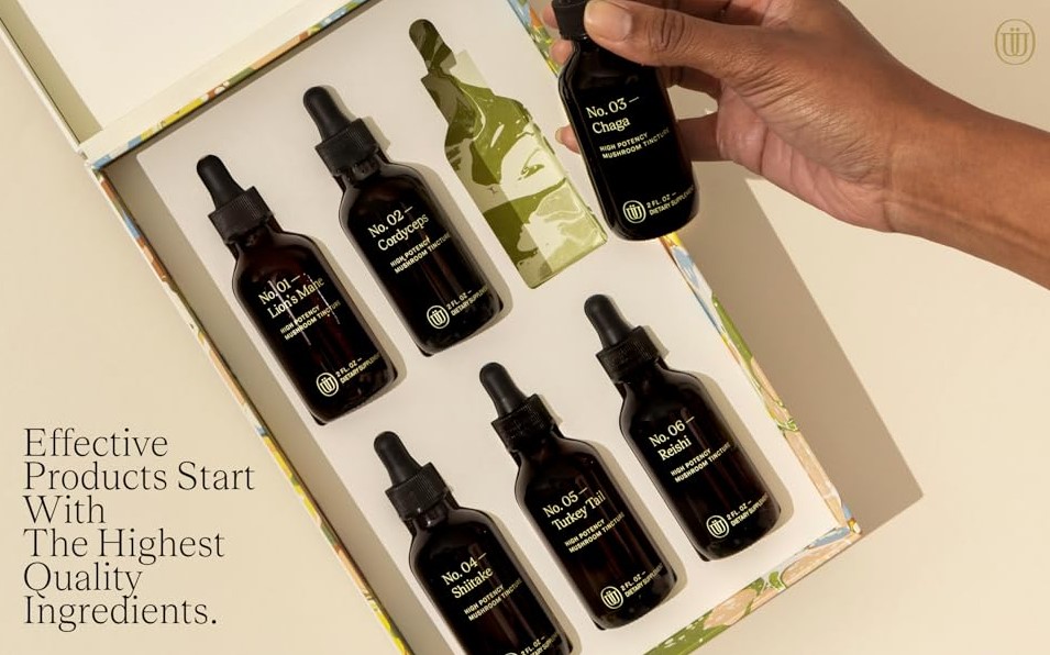 המארז כולל 6 תמציות פרימיום במיצוי כפול (Dual Extract), כל אחת מהן מבוססת על פטריית מרפא מוכרת ונחקרת, הידועה בתרומתה הייחודית לבריאות הגוף והנפש:רעמת האריה, ריישי, קורדיספס, צ’אגה, זנב הודו ו-שיטאקה. כל בקבוק מכיל כ-59 מ"ל של תמצית מרוכזת, אשר מופקת מגוף הפטרייה בתהליך כפול (מים ואלכוהול) לשמירה על מלוא הרכיבים הפעילים – פוליסכרידים, טריטרפנים, נוגדי חמצון ועוד.